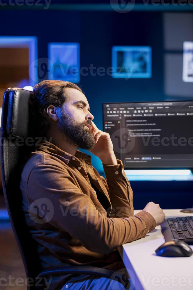 Bored programmer fixing vulnerabilities in software enabling hackers to compromise systems, waiting for shift to end. Impassive man wearied by job, using PC to patch security exposures Pro Photo