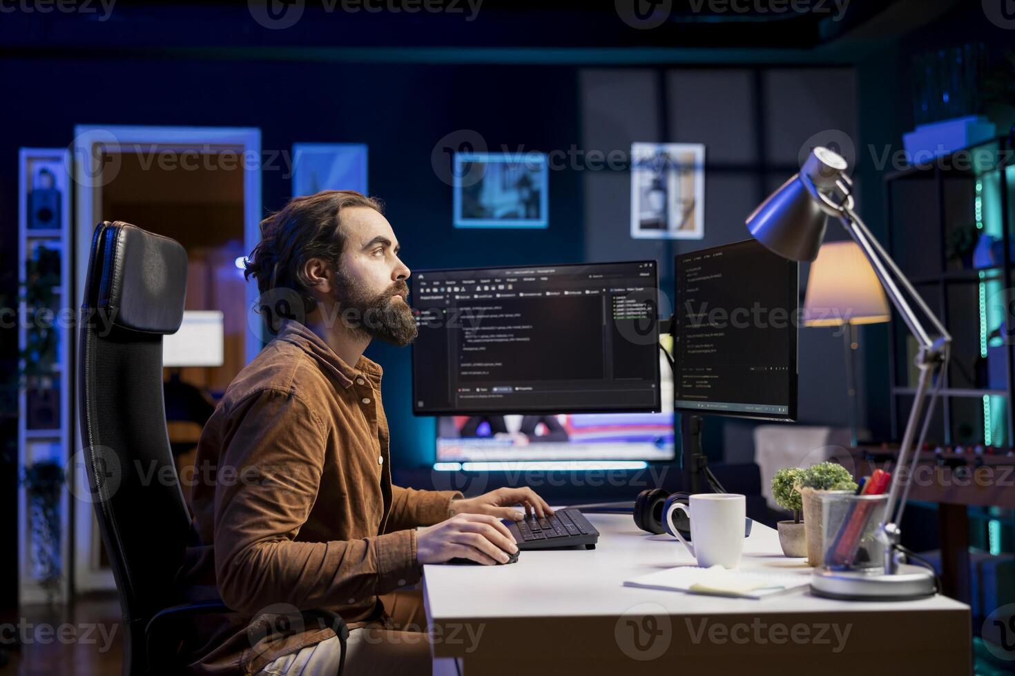 Programmer working from home securing company servers from DDoS attacks to avoid unwanted breakdowns. Expert writing code to build advanced firewalls protecting data from potential threats Pro Photo