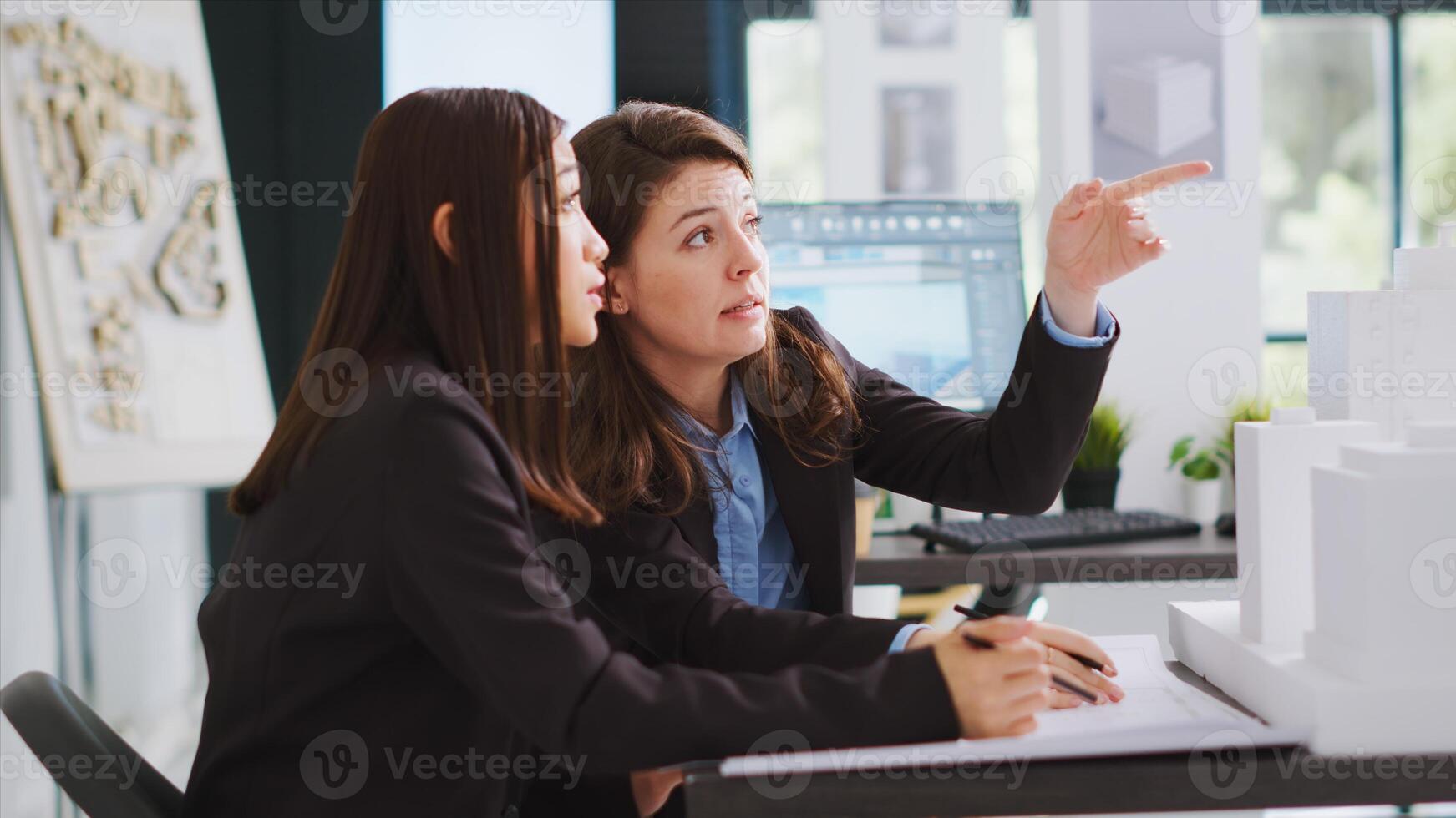 Developers trying to design blueprints for new construction site, working together to draw lines and create architectural drafts for project. Technicians examine 3d printed models at workstation. Pro Photo