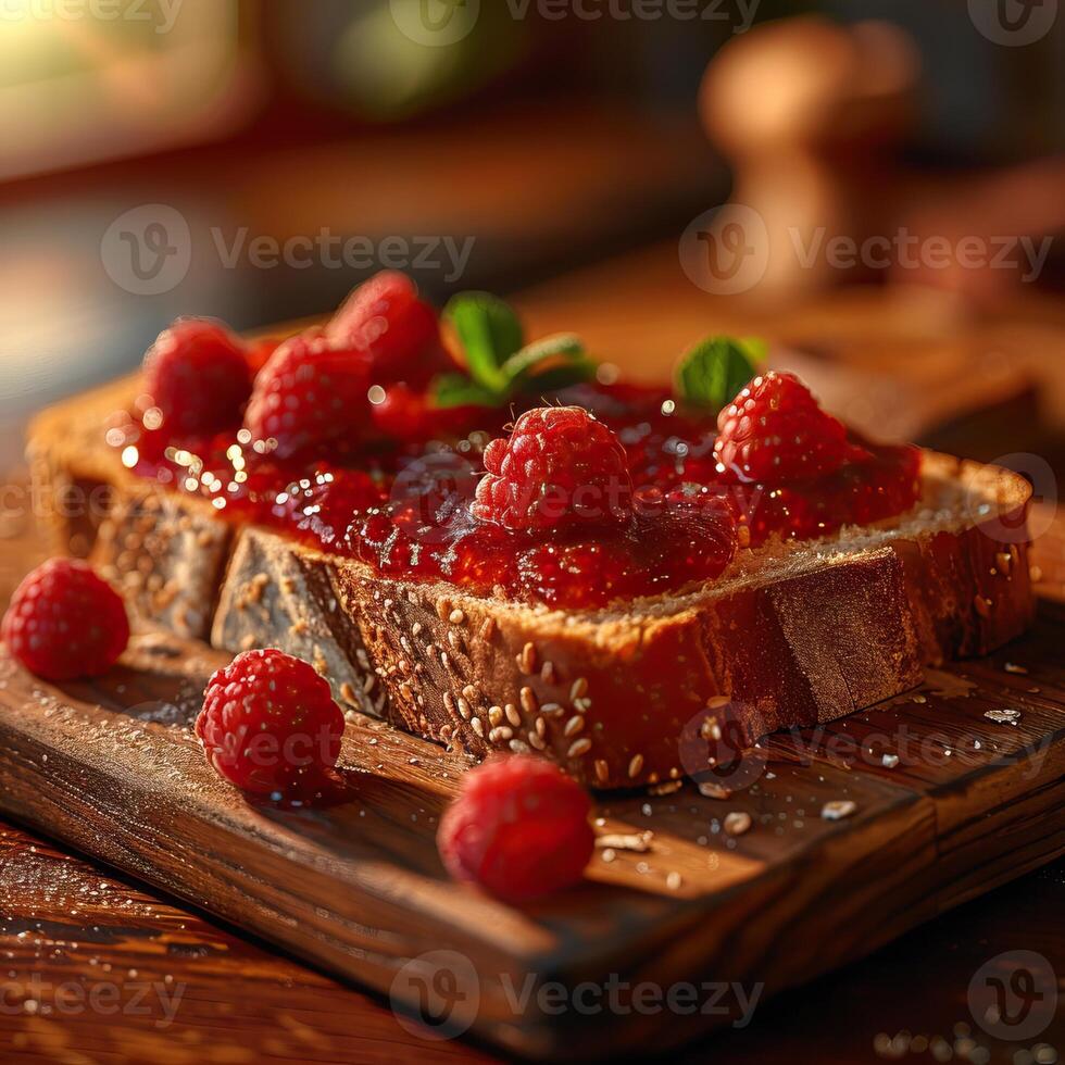 A slice of toast with raspberry jam topped with fresh raspberries, served on a wooden board with a warm, cozy background. Pro Photo