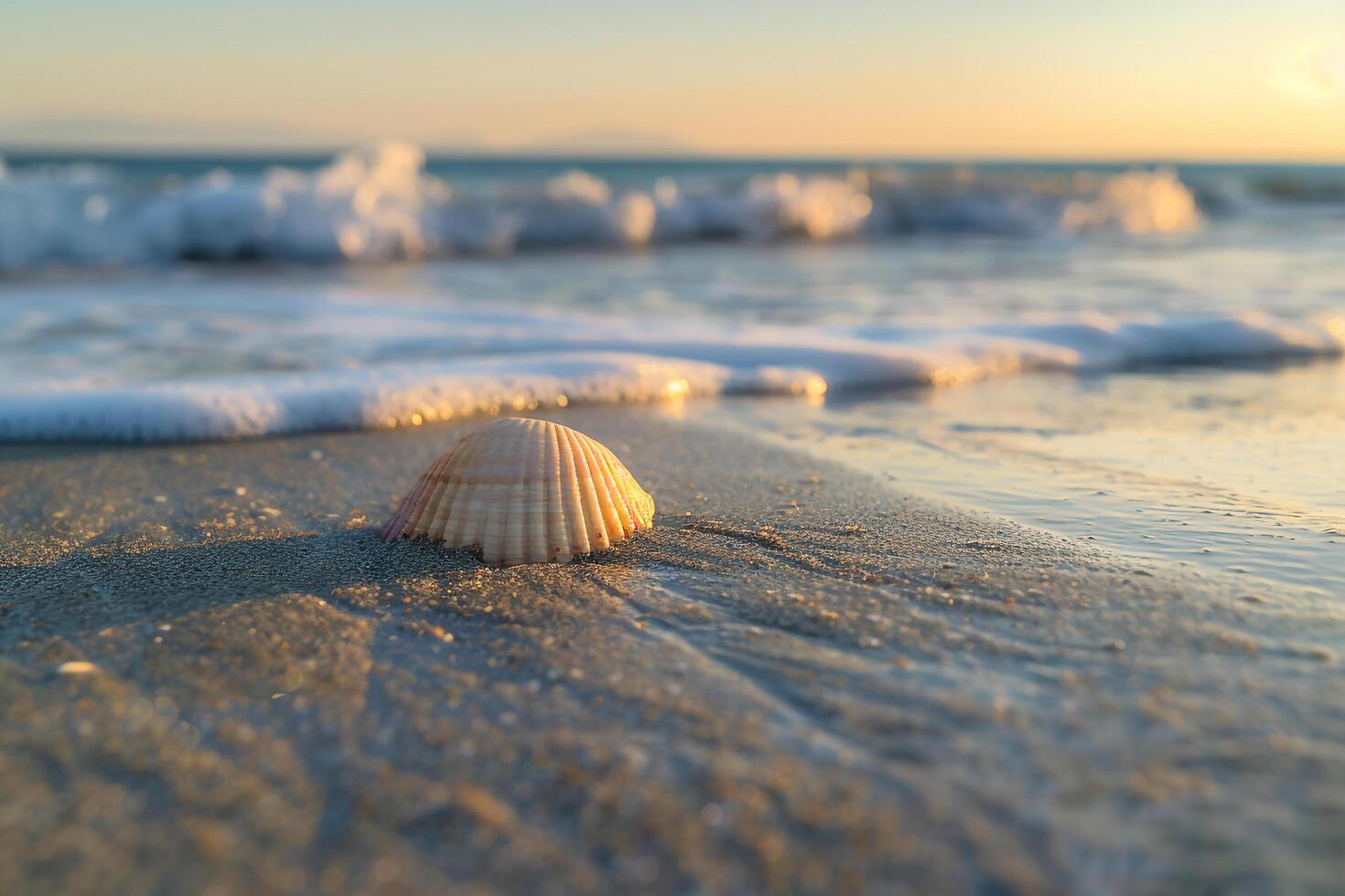 Smooth sandy beach with single seashell resting on the shore with waves gently lapping background nature photo