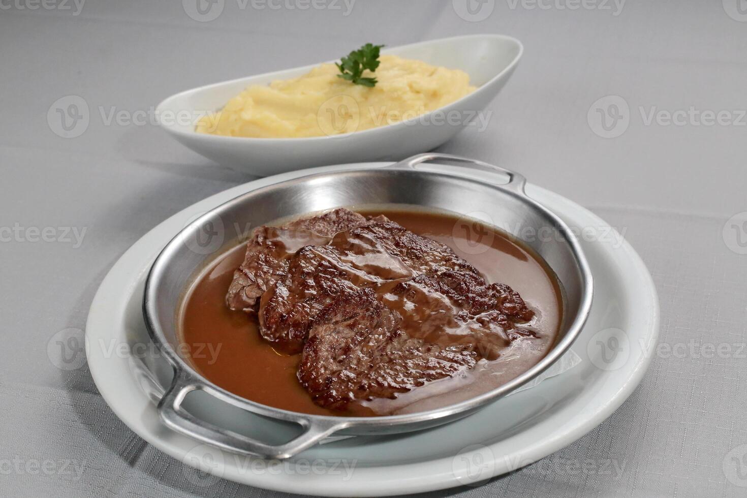 Filet mignon with Marsala sauce and mashed potatoes on a plate Pro Photo