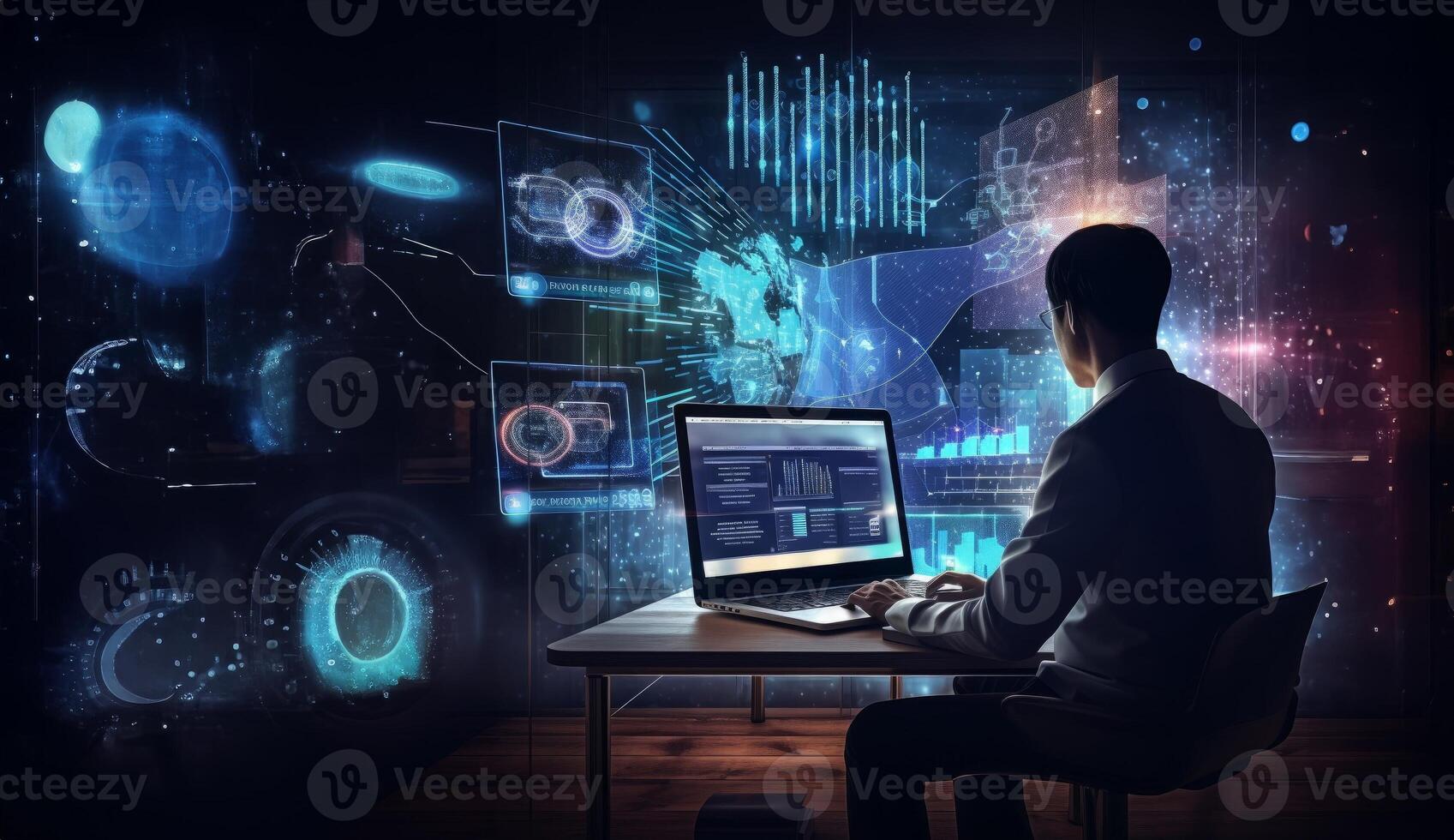 A business executive in a sharp suit engages in a hacking scenario, strategically utilizing a laptop amid a technologically immersive environment filled with holographic displays Pro Photo