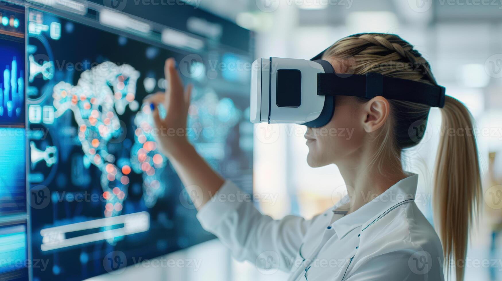 Young professional using virtual reality headset to interact with digital interface in modern office setting, exploring data visualization. Pro Photo