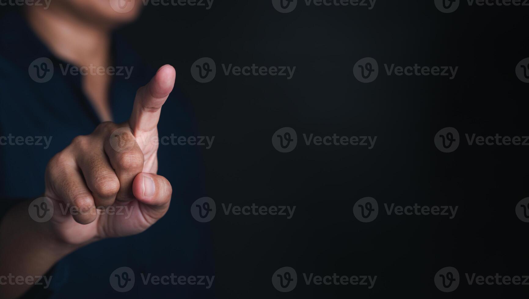 Businessman in front of visual touch screen or pointing to something on black background with space for text Pro Photo
