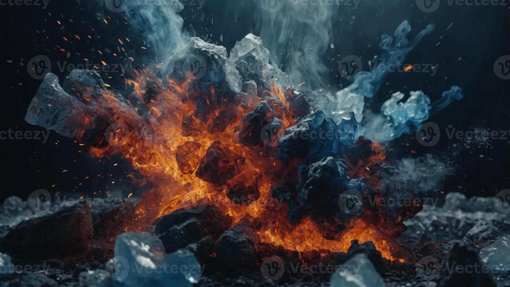 Fire and ice concept Good and evil Hot and cold Exploding fire Exploding ice Smoke with ashes. Pro Photo
