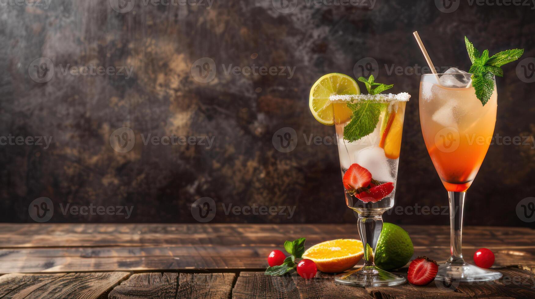 two cocktails on the table. Gray background with space for text. Menu Pro Photo
