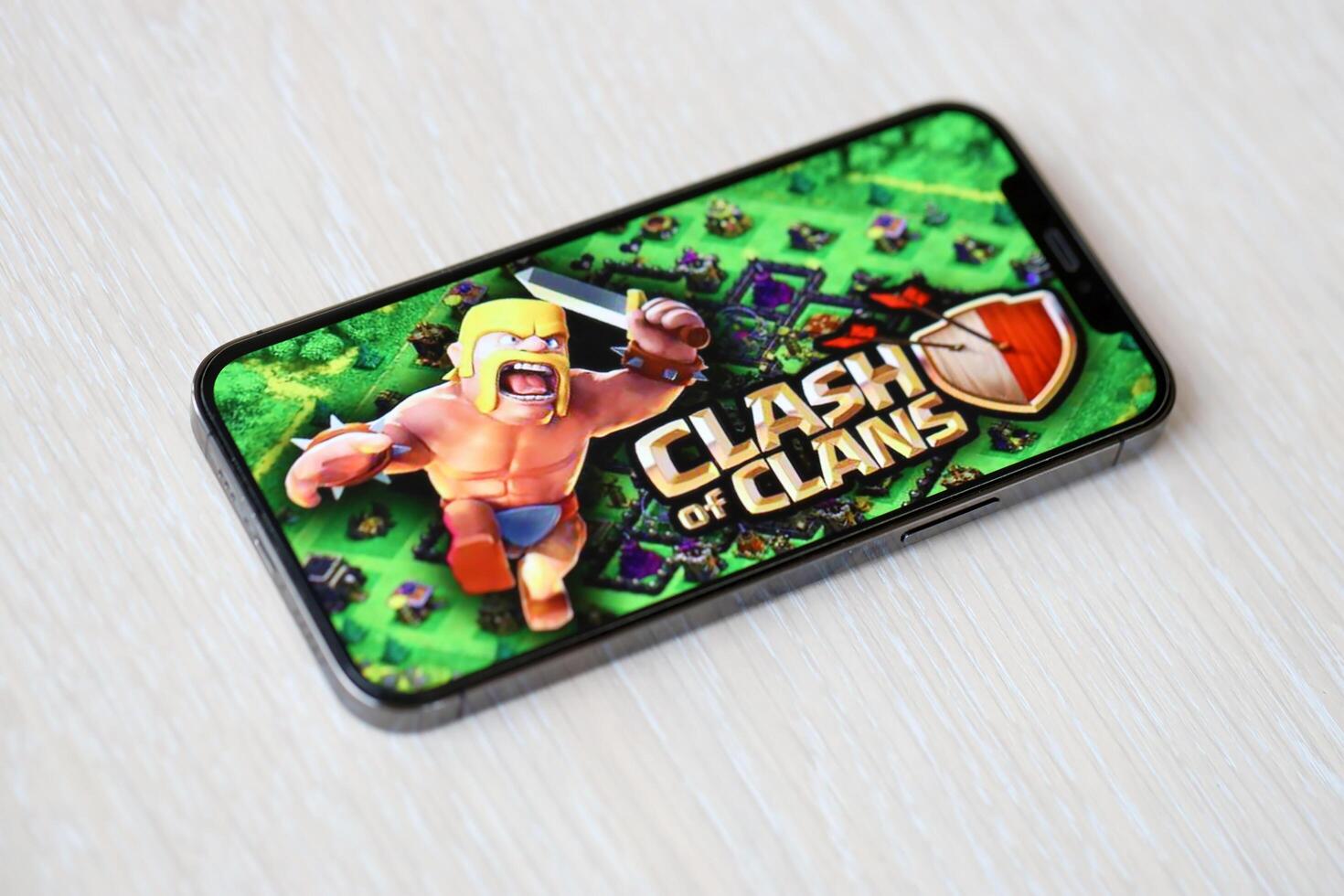 Clash of Clans mobile iOS game on iPhone 15 smartphone screen on wooden table during mobile gameplay