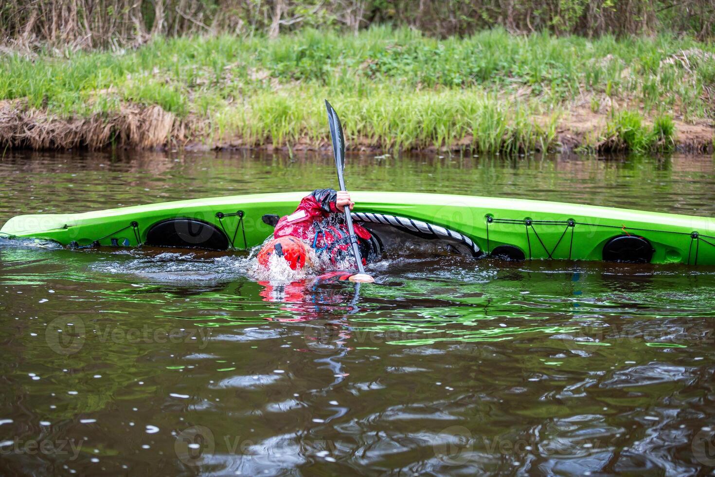 adventurous kayaker in a bright green kayak practicing the eskimo roll technique in a calm river surrounded by lush vegetation during an overcast day Pro Photo