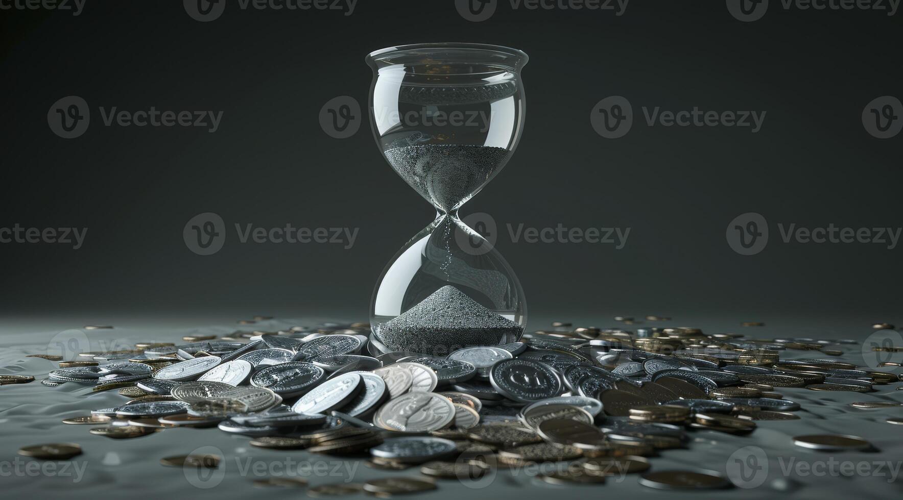An artistic hourglass surrounded by an array of coins symbolizes the deep and profound connection between the inevitable passage of time and the intricate and complex concept of wealth in our lives Pro Photo