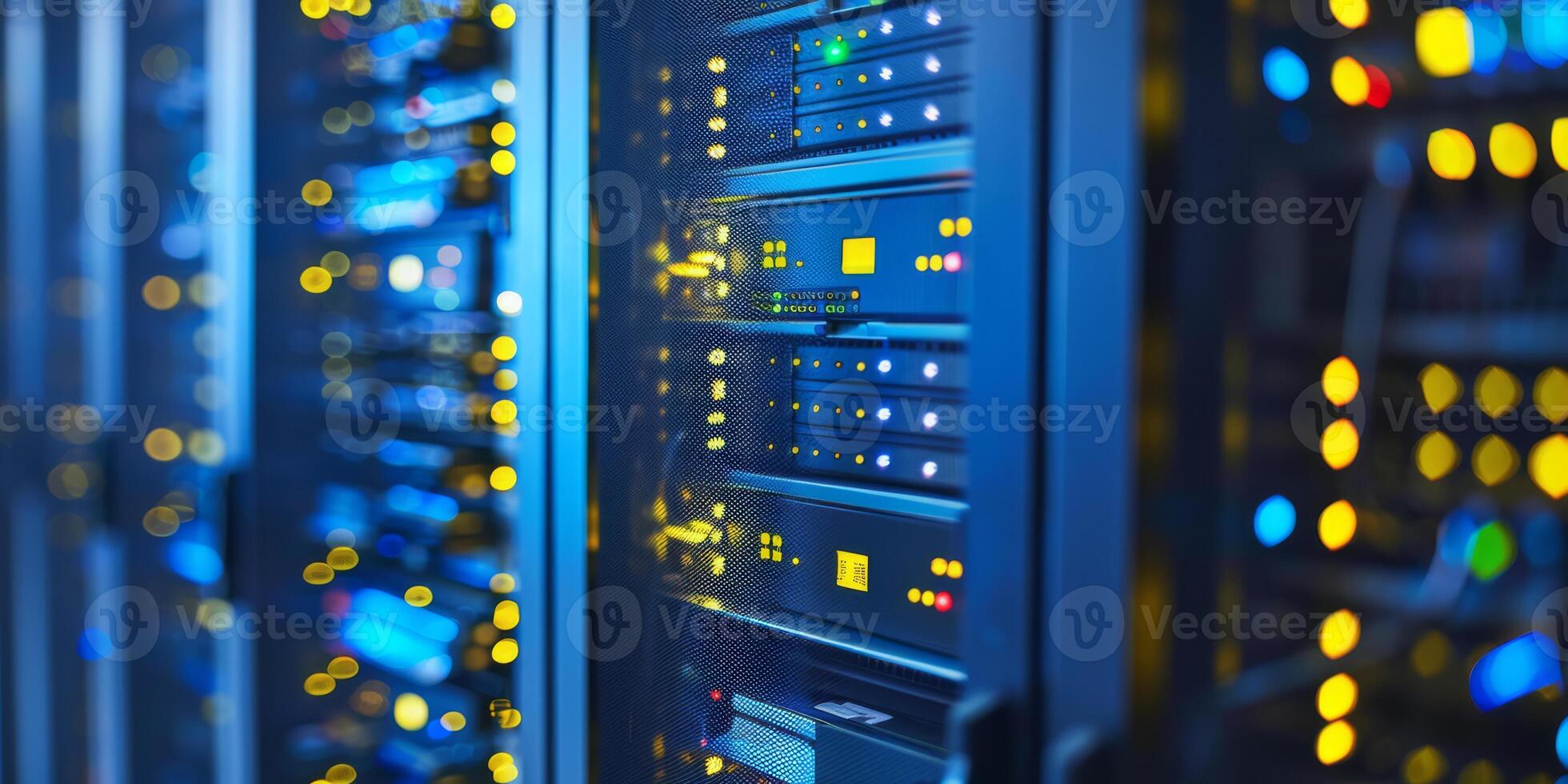 Illuminated server racks display cuttingedge technology within a contemporary, stateoftheart data center Pro Photo