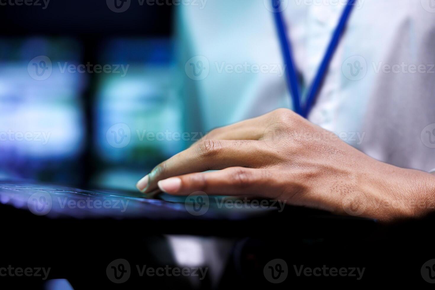 Extreme close up shot of employee using laptop in data center providing vast computing resources and storage. Blade servers enabling ai to process massive datasets for training and inference Pro Photo