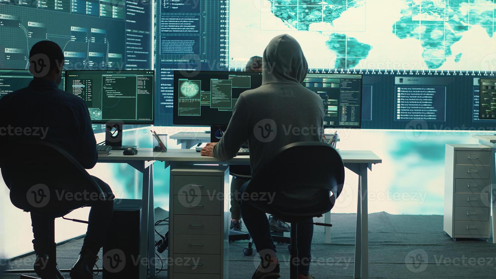 Cyber operations center with governmental hackers working on digital security activities during hybrid war. Specialists team ensuring security and malware detection, cyber surveillance. Camera A. Pro Photo