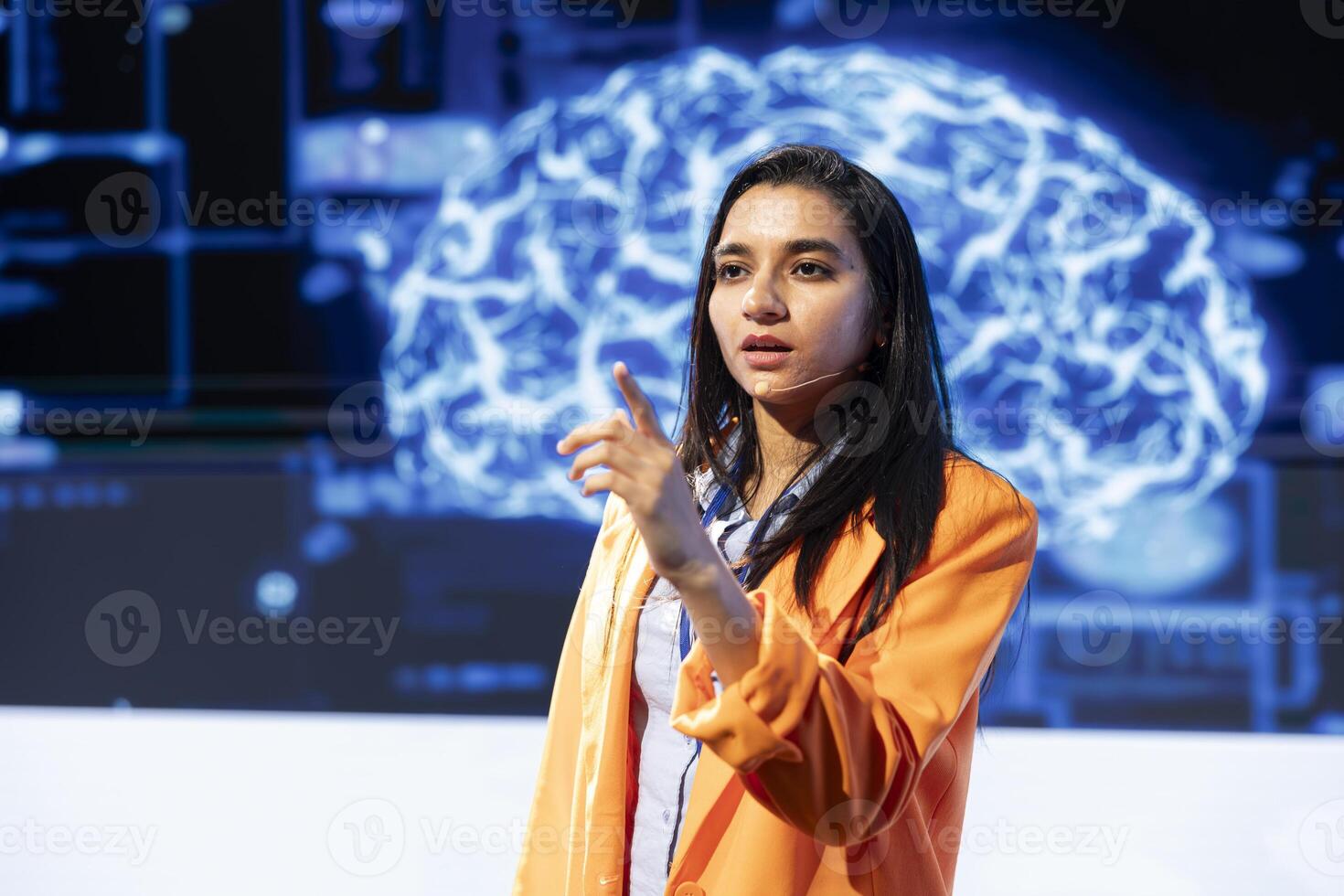 IT technician speaking at tech event, explaining impact of AI technology on world. Woman presenting risks and threats associated with AI during conference, pointing to screen Pro Photo