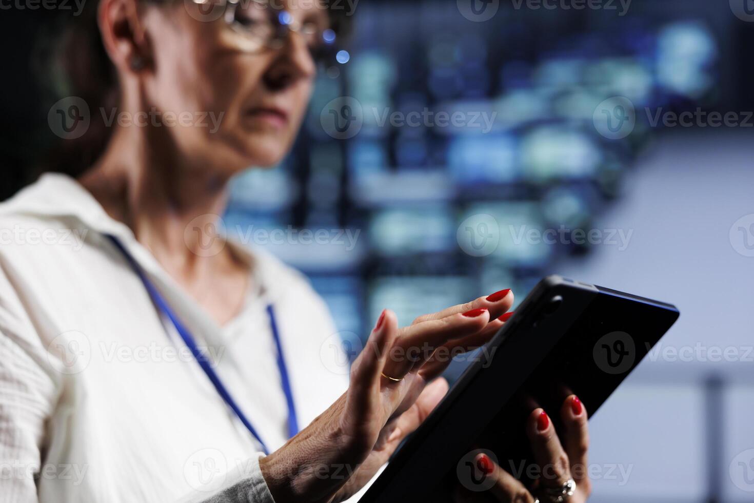 Elderly system administrator using tablet to make sure data remains shielded from security headaches, safeguarding technologically advanced workspace servers against unauthorized access, close up Pro Photo