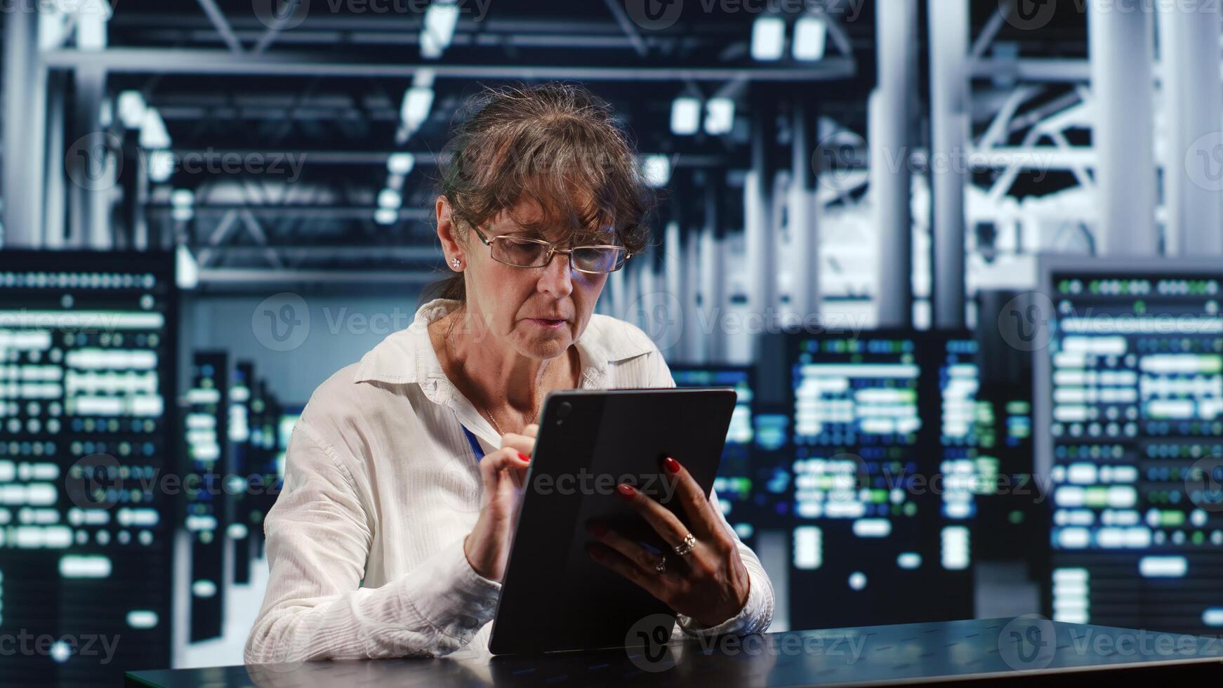 Cloud computing business executive working in data center housing GPU dedicated servers that can process AI tasks with high efficiency, investigating rigs used for machine learning showing pitfalls Pro Photo