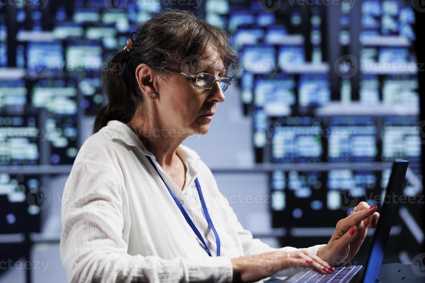 Aged employee preparing server hardware contingency plan, monitoring data center energy consumption across parts, making sure sensors are functioning smoothly, doing routine disk checks Pro Photo