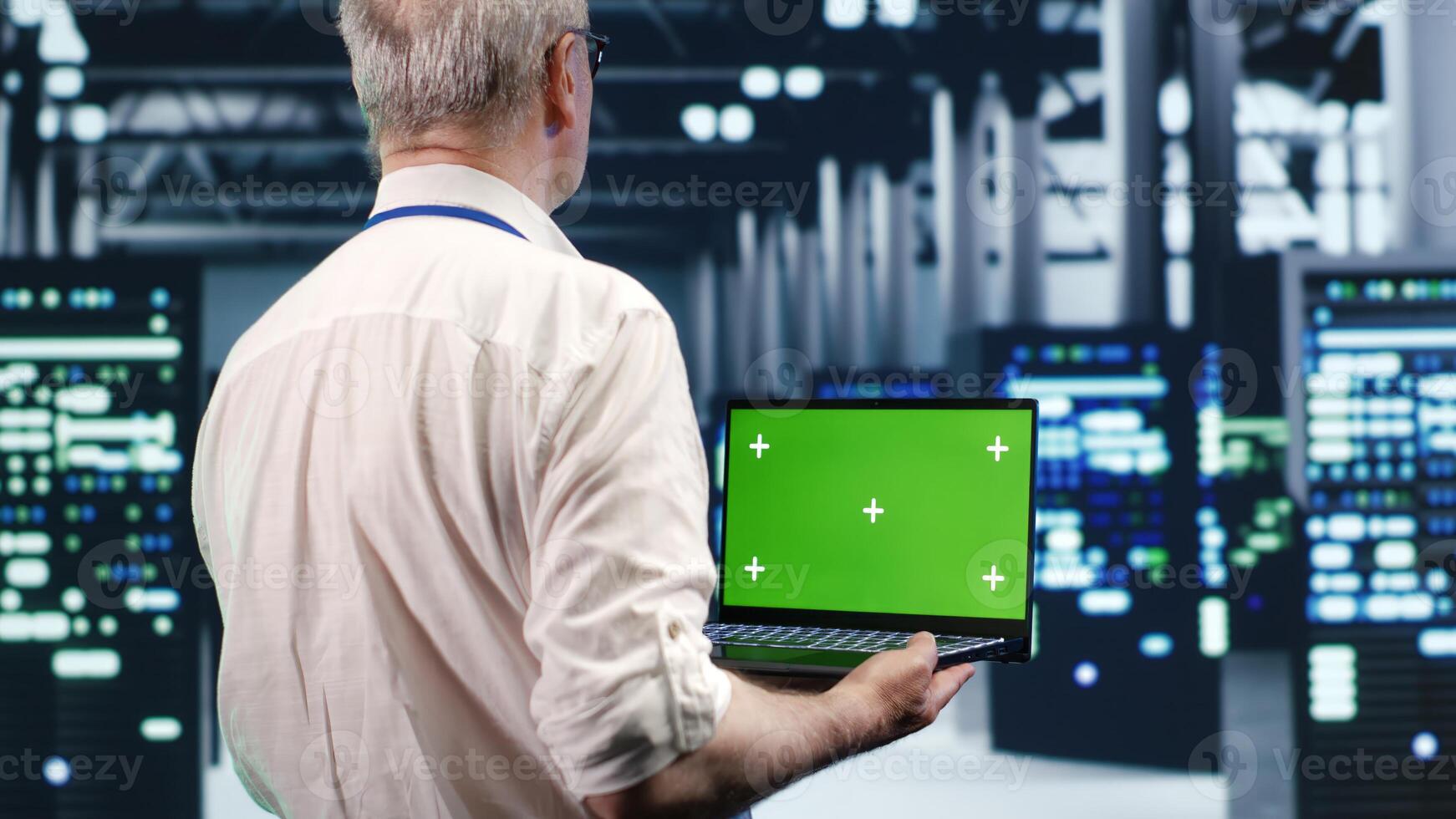 Efficient IT professional navigating network of server rigs in industrial hub. Expert using mockup laptop, ensuring proper operations, doing optimizations and maintenance in data center Pro Photo