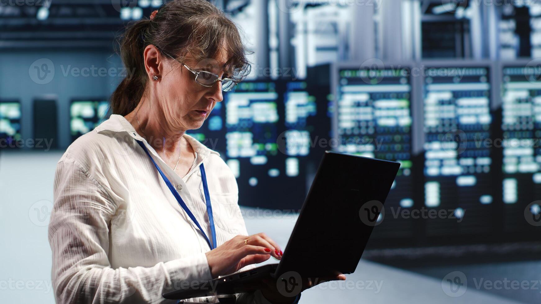 Knowledgeable supervisor working in data center housing GPU dedicated mainframes that can process AI tasks with high efficiency, mending damaged server components used for machine learning Pro Photo