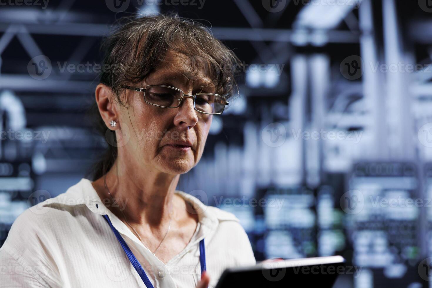 Precise serviceman in high tech business providing computing resources needed for AI to process extensive datasets for training. Server equipment storing datasets used for machine learning, close up Pro Photo