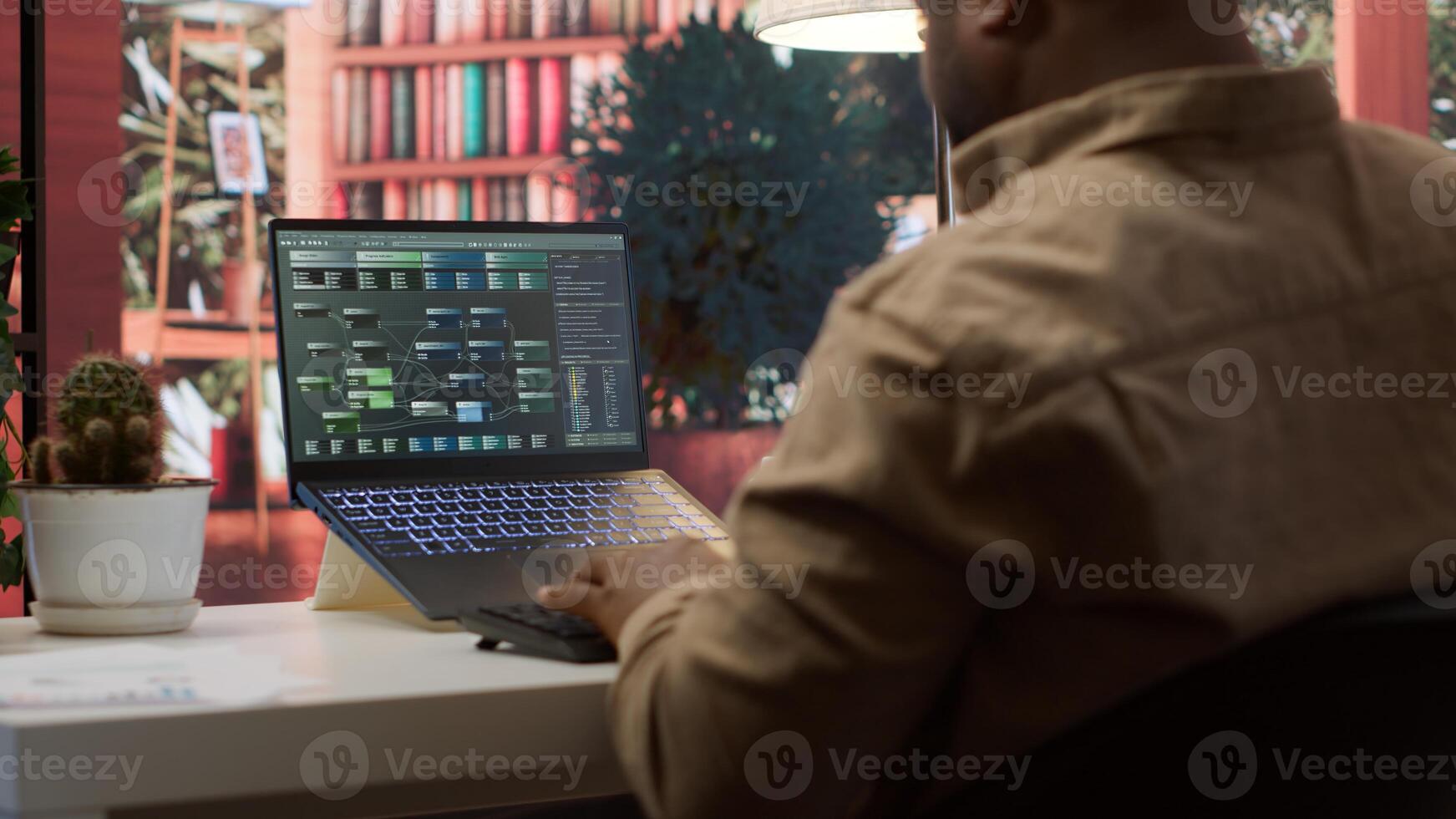 AI software engineer coding modern innovative development project on his gadgets, showcasing machine learning and data processing on neural network. Artificial intelligence business. Camera A. Pro Photo