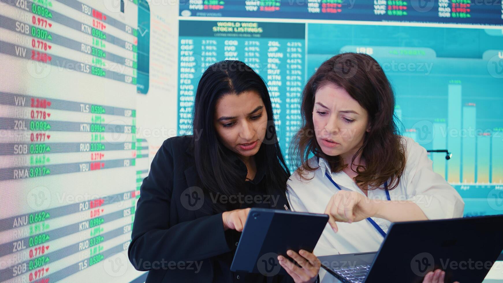 Coworkers team analyzing infographics to provide solutions on an issue affecting the project, looking to finish tasks before deadline. Business employees working together to ensure progress. Camera B. Pro Photo