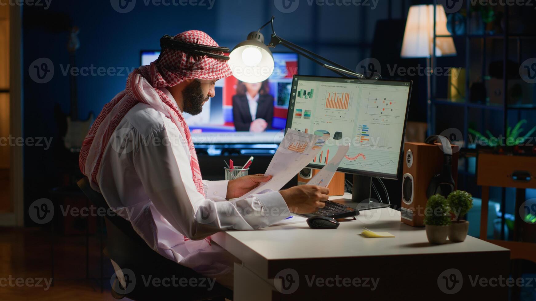 Arabic teleworker checking analytics statistical data set while remotely working in apartment office. Company executive optimizing key performance indicators with tv as background noise Pro Photo