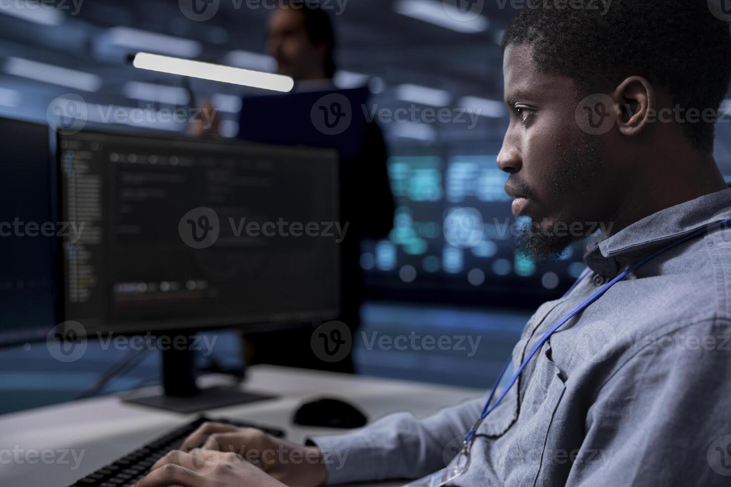Computer scientist reconfiguring server room to optimize it for data processing requirements of customers. Programmer typing on PC, ensuring data center equipment operates efficiently, close up Pro Photo