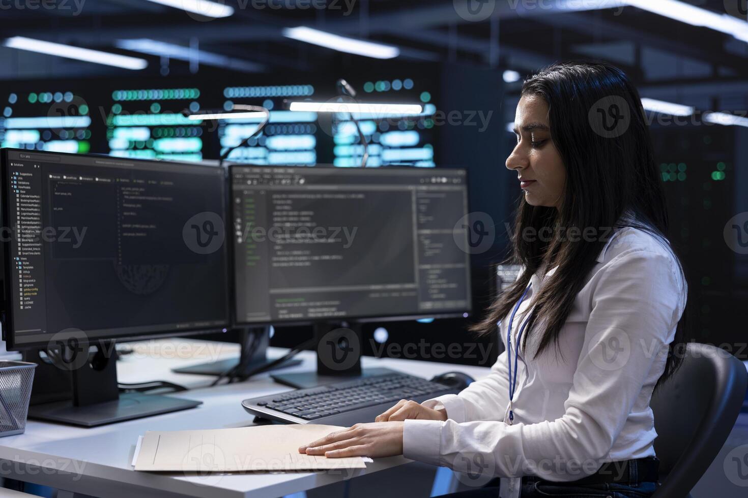 Data center manager checking emergency procedures documents to ensure company continuity in case of system failure. Inspector in high tech server hub ensuring compliance with industry regulations Pro Photo