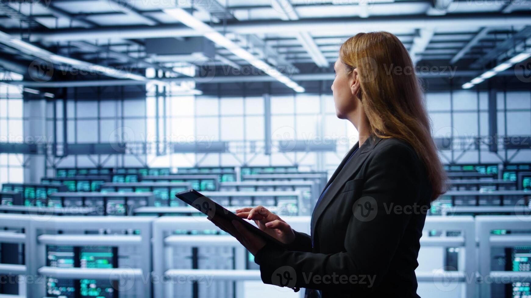Computer scientist doing checkup, inputting data on tablet of needed fixes in server hub. Woman working in data center housing advanced data storage infrastructure supporting IT workloads, camera B Pro Photo