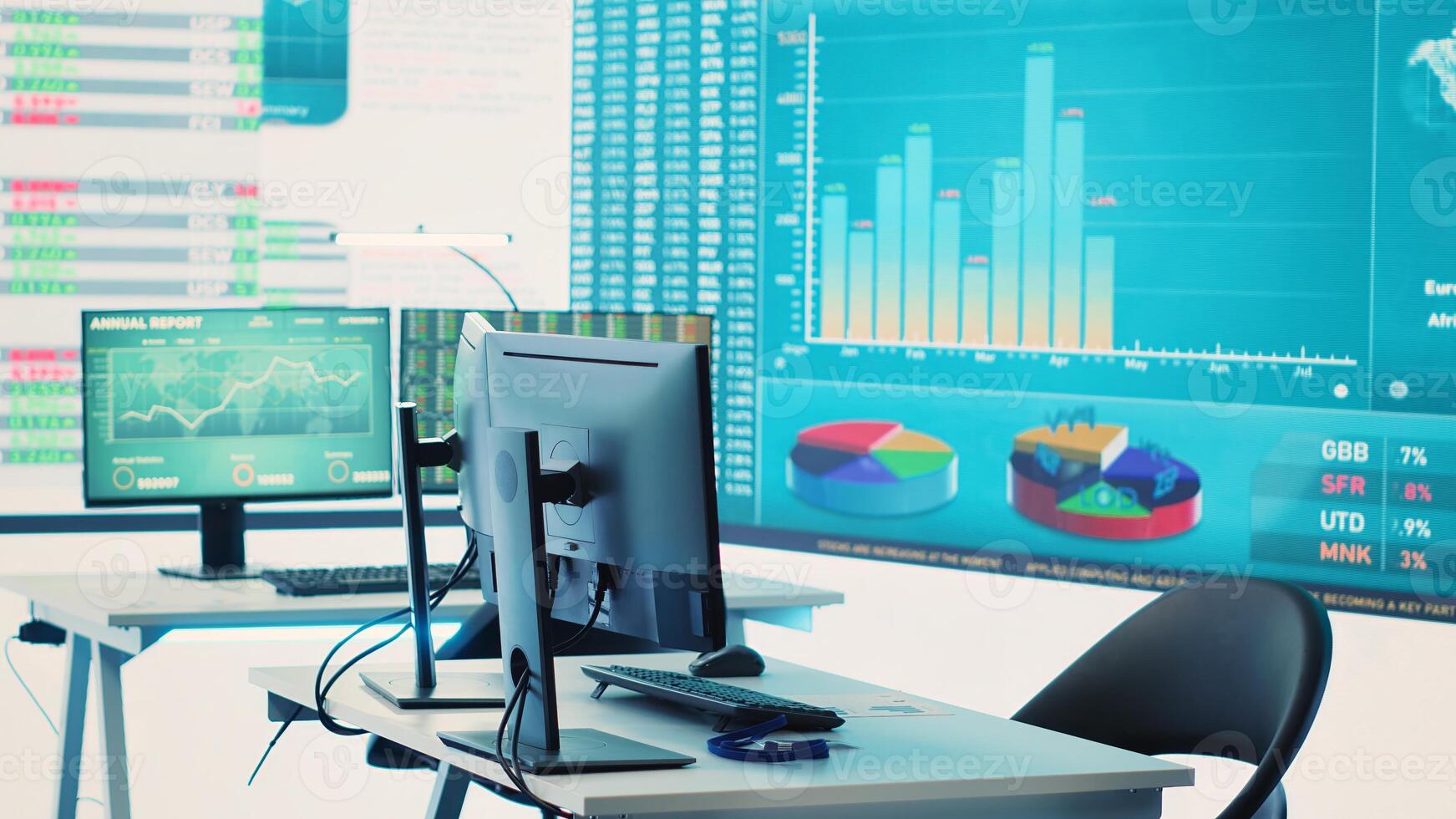 Professional enterprise headquarters equipped with big data screen and multiple computers, business coworking space. Empty startup office used by employees to examine project statistics. Camera A. Pro Photo