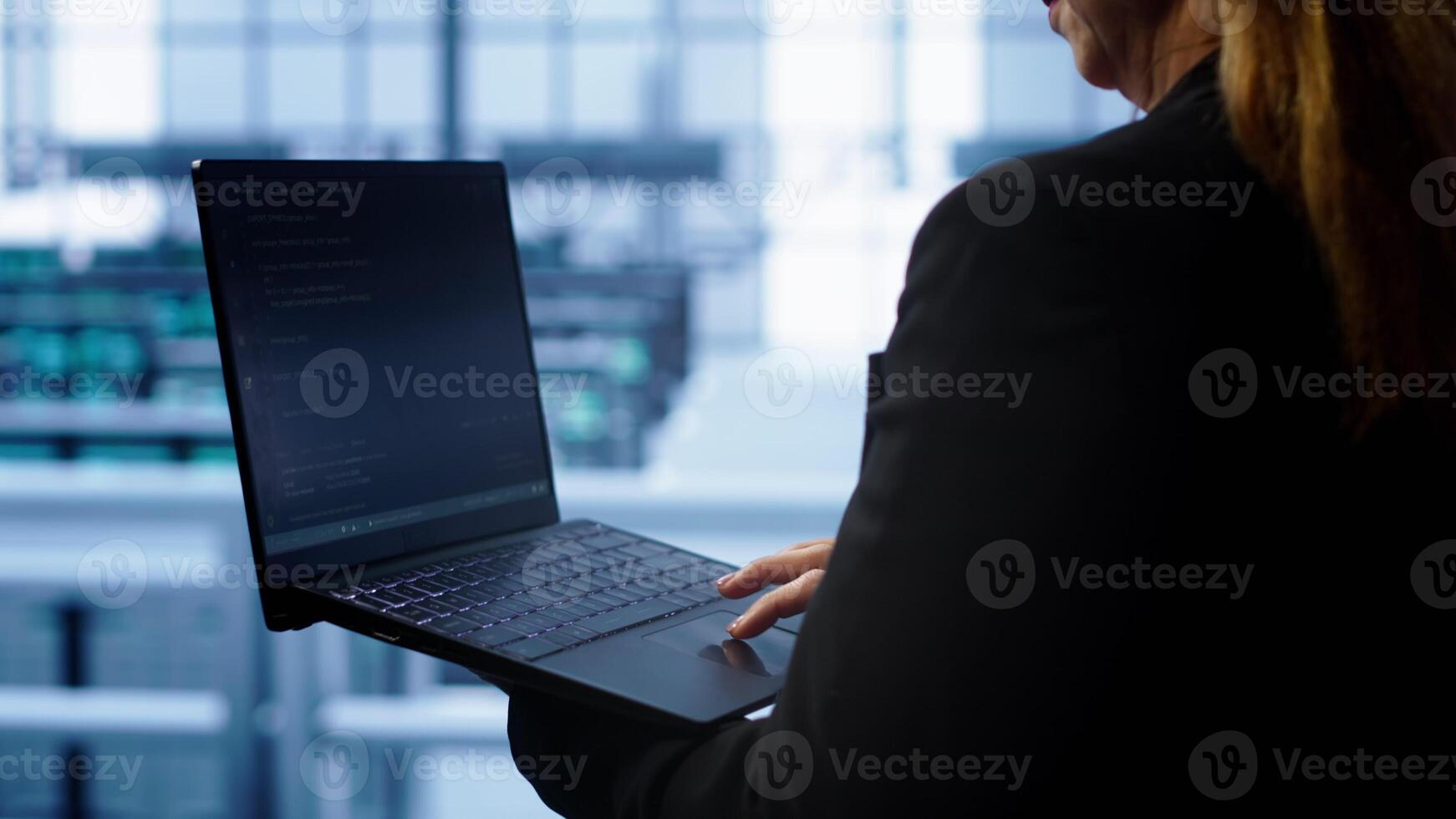 Technician doing checkup, inputting data on laptop of needed server hub fixes. Close up of employee working in data center housing advanced storage infrastructure supporting IT workloads, camera A Pro Photo