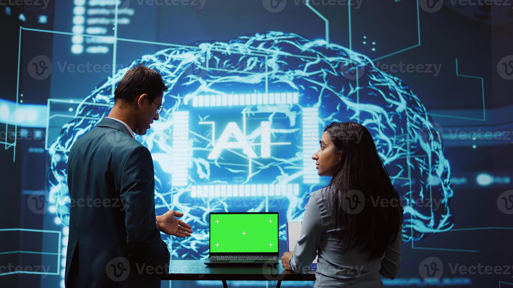 AI developers using isolated screen device for business data analysis. IT department staff members work on chroma key notebook to automatize tasks using artificial intelligence, camera B Pro Photo
