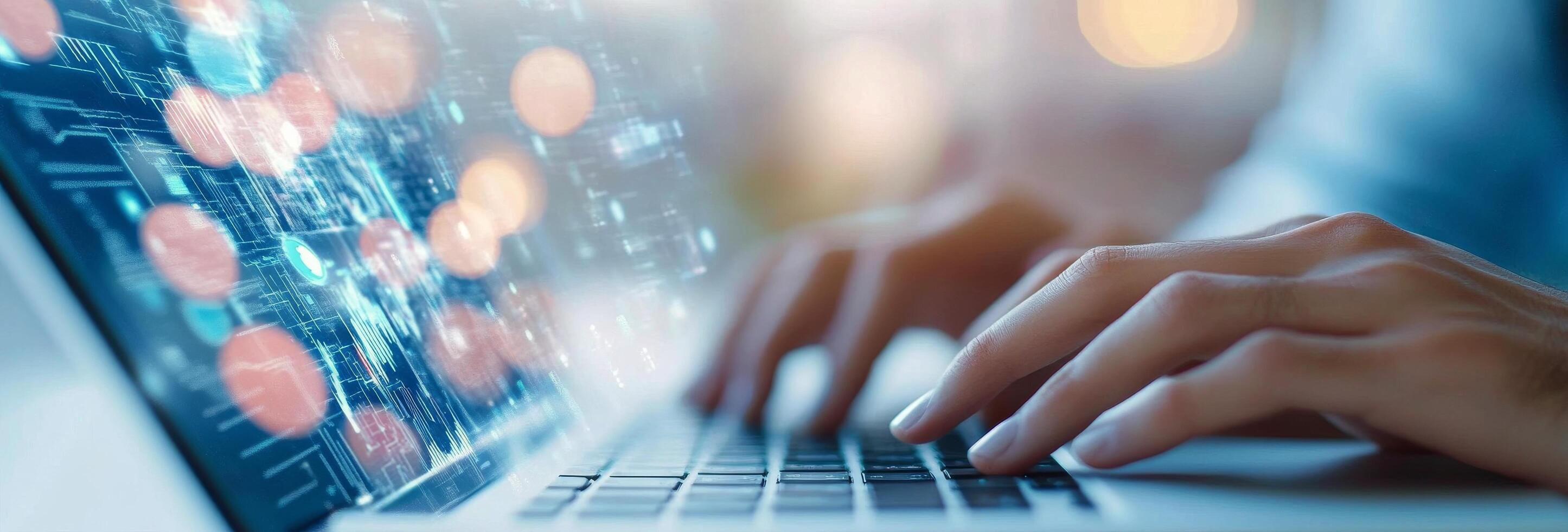 Person typing on a laptop while data visuals appear in a modern workspace photo