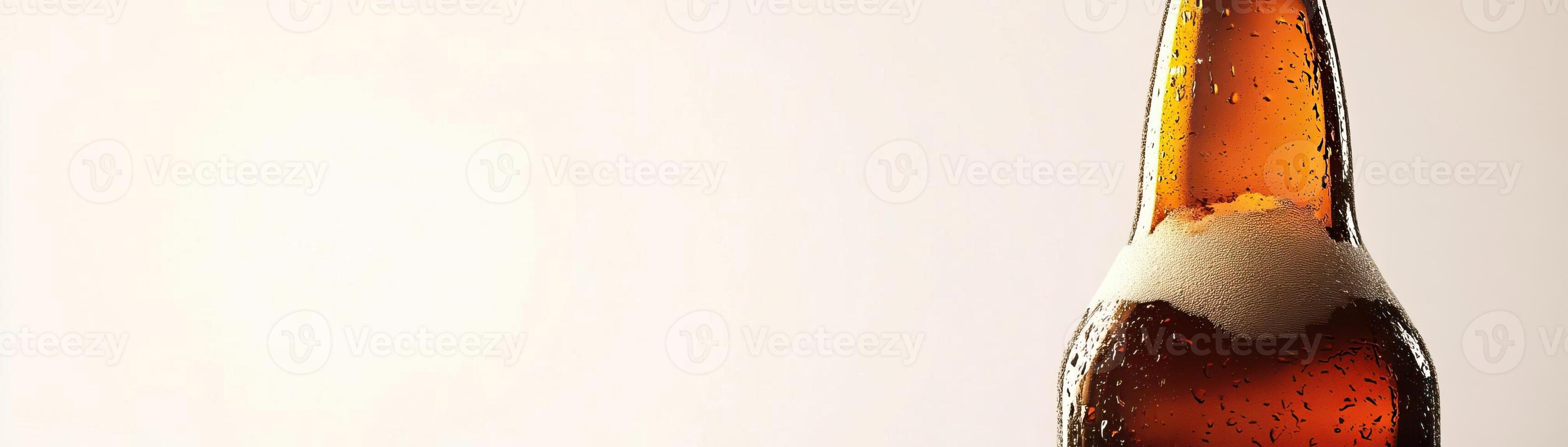 1 A highkey image of a craft beer bottle, light streaming through to highlight its contents, set against a stark white background, broad space on the left for promotional text Pro Photo