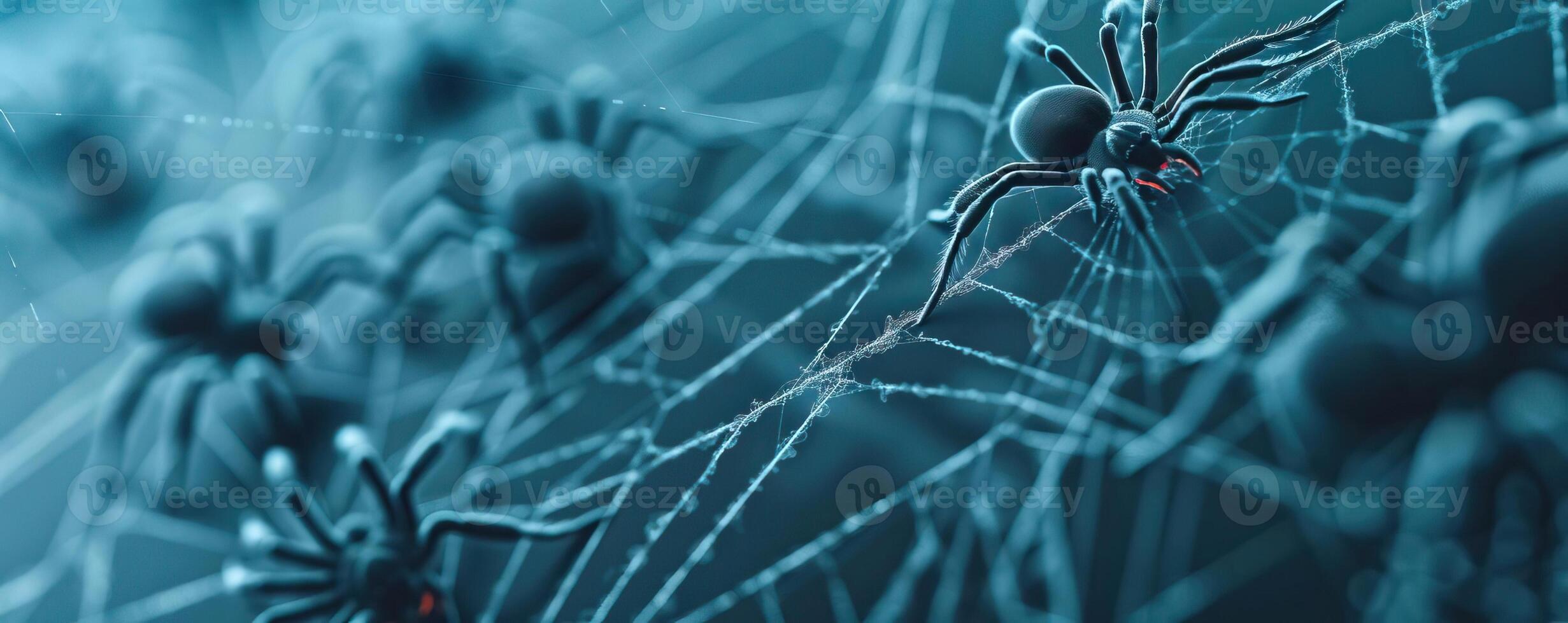 Detailed spider webs with crawling spiders, forming a creepy background, editorial photography, empty space for text on side Pro Photo