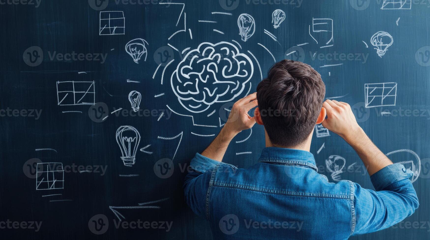 Man brainstorming on chalkboard with diagrams and brain sketch, thinking and analyzing ideas and concepts, focused and creative work. Pro Photo