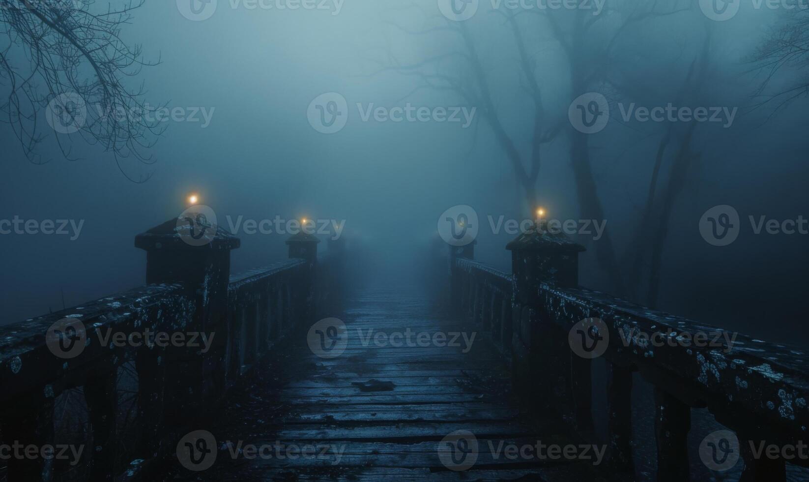 A foggy bridge leading into a dark forest with distant glowing eyes, leaving space at the bottom for text Pro Photo