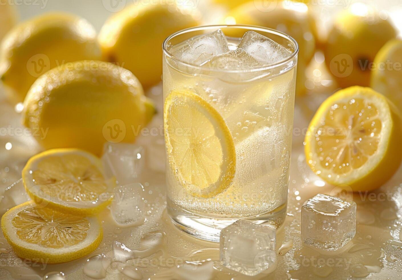 A refreshing glass of lemonade with ice cubes and lemon slices Pro Photo