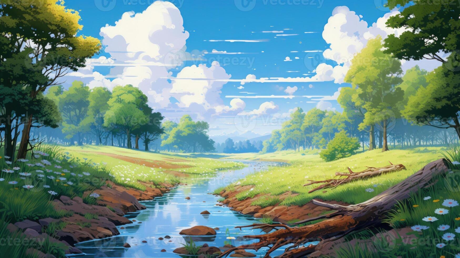 A serene forest scene with a winding stream, green grass, and a fallen log in the foreground. Pro Photo