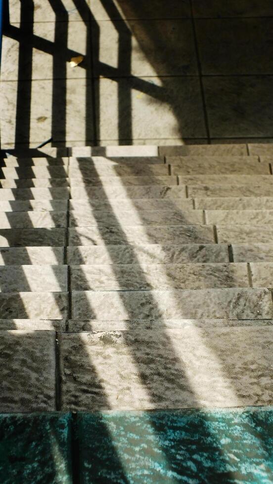 Abstract background texture of a staircase with a geometric shadow cast on it. The shadow is on the steps and the steps are grey photo