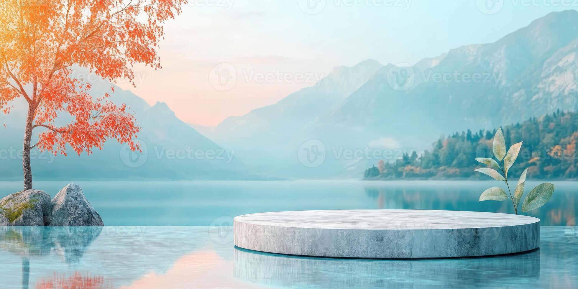 Stone Platform Floating on a Lake with Autumn Tree and Mountain Backdrop Pro Photo