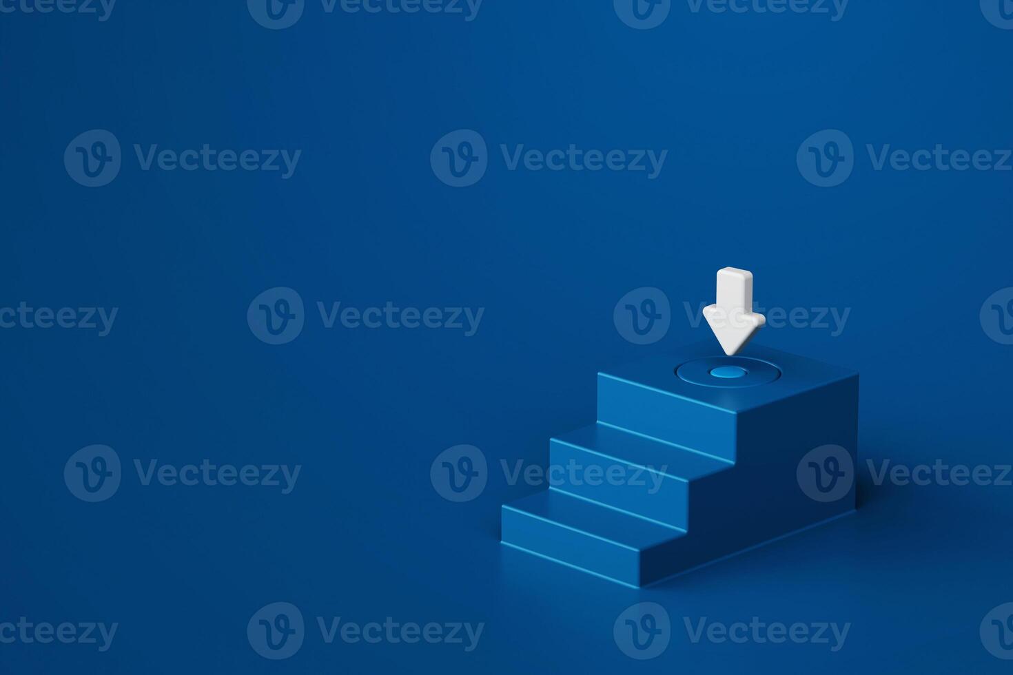 Minimalistic blue staircase leading to platform with button and white arrow pointing towards it, symbolizing action or step by step process, 3d rendering Pro Photo