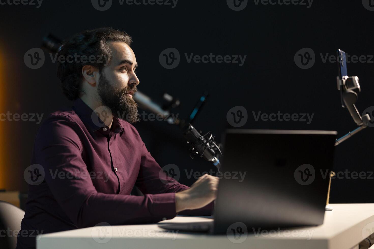 ASMR creator using quality mic and cellphone on selfie stick to do anti stress , using whispering voice while reading from laptop. Man using professional microphone to create ambient sounds Pro Photo