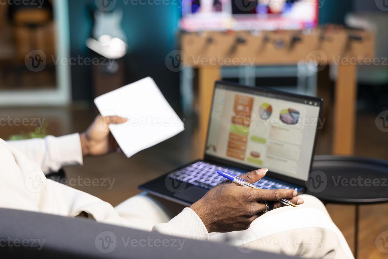 Freelancer working from home doing math calculations using statistical data financial graphs. Remote worker comparing company profit using business charts economic figures, writing on notepad Pro Photo