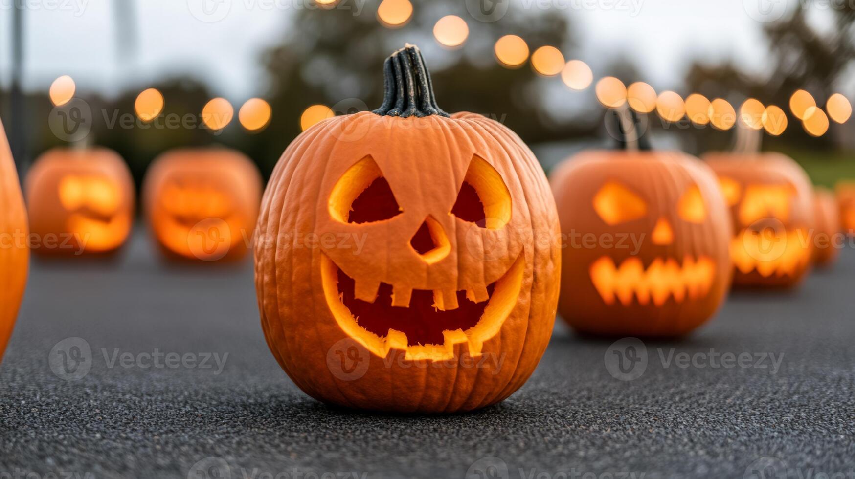 A lineup of intricately carved pumpkins on display each with unique designs from spooky faces to elaborate patterns with a festive autumn backdrop and string lights Pro Photo