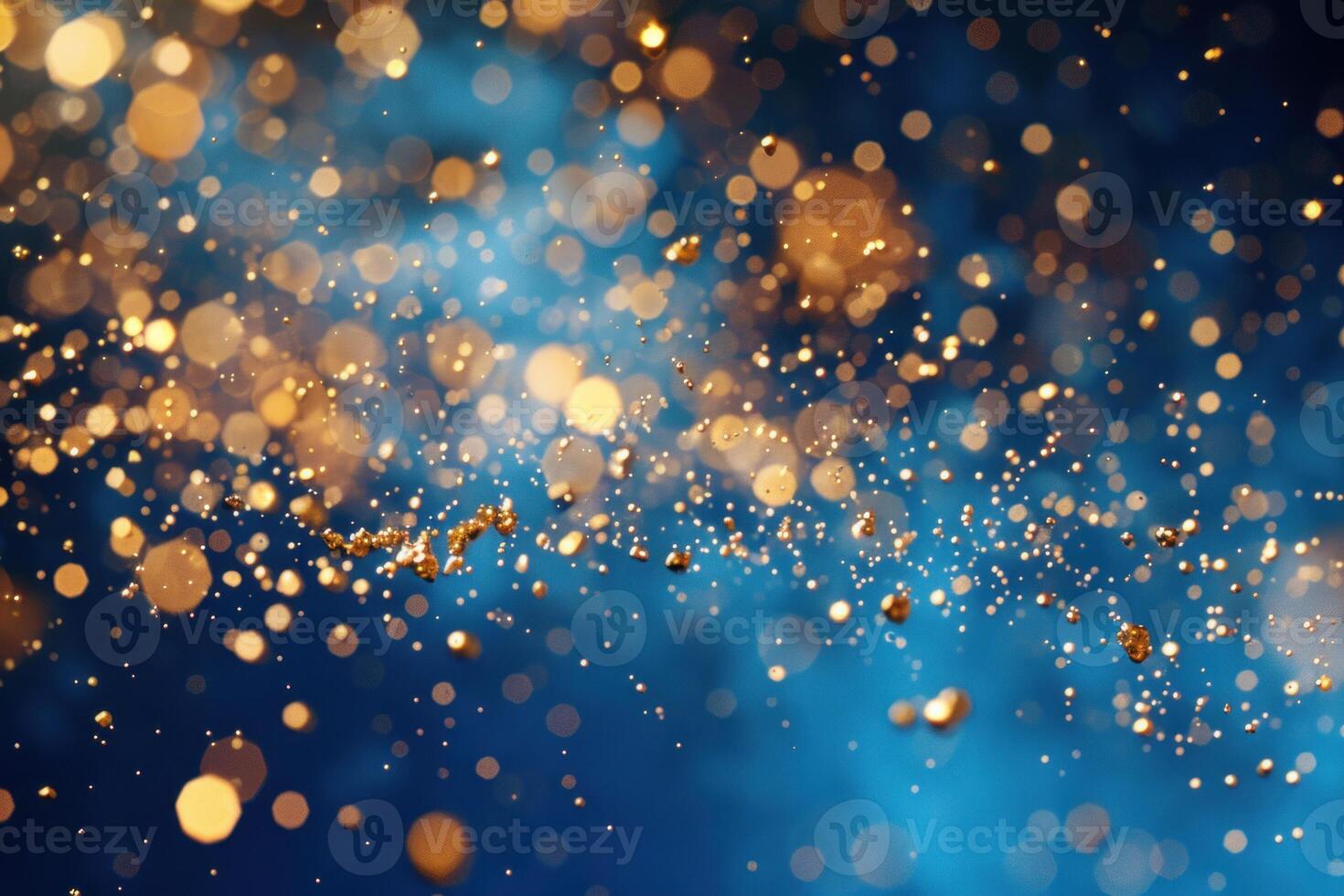 Golden particles exploding creating a festive bokeh effect on blue Pro Photo