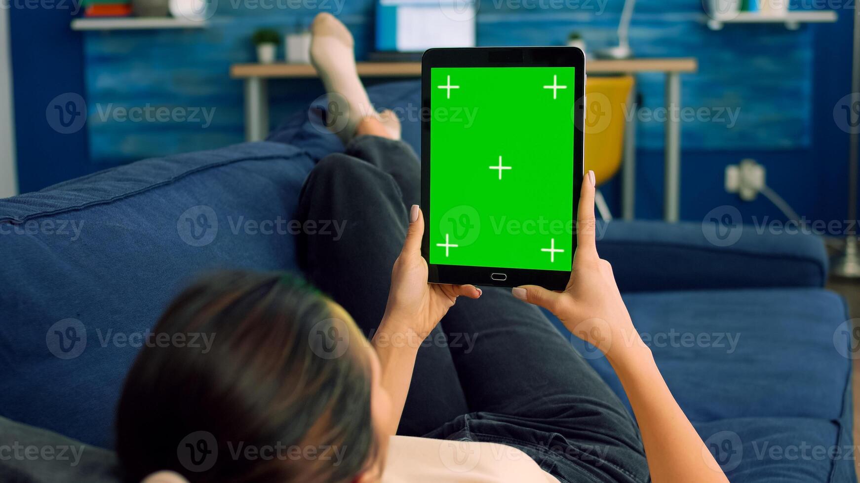 Casual woman lying on sofa using tablet computer mock up green screen chroma key in vertical portrait mode. Freelancer browsing on internet with isolated device for online project Pro Photo