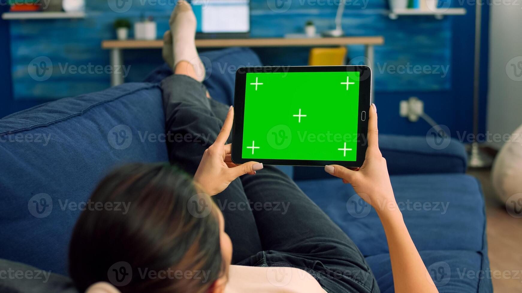 View of shoulder of woman uses isolated tablet computer with mock up green screen chroma key sitting on sofa in living room. Freelancer using technology communication concept for online template Pro Photo
