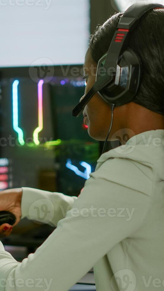 Pro african gamer playing online space shooter game on powerful computer using wireless controller and headset. Competitive cyber player woman performing videogame tournament use professional joystick Pro Photo